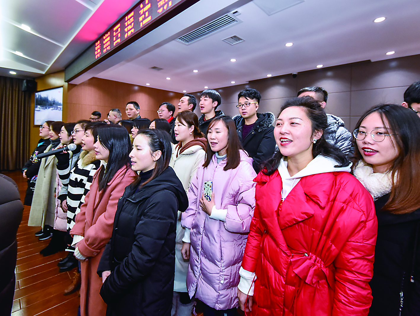 “让我们放声歌唱,歌唱伟大的祖国,歌唱美好的明天。”赵先辉致辞后,株洲日报社全体职工高唱《我的祖国》《歌唱祖国》《我和我的祖国》,职工们以特殊的形式开启了新一年的工作。