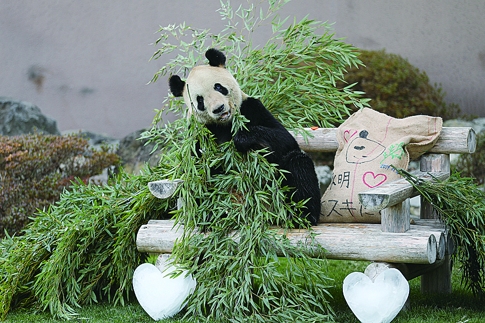 2月14日,在日本和歌山县白浜野生动物园,大熊猫“永明”在收到的礼物——“靠垫”旁吃竹子。 当日,日本和歌山县白浜野生动物园的工作人员为已满26岁的旅日大熊猫“永明”送上了特别的情人节礼物——用新鲜竹叶和麻袋制成的“靠垫”,上面用日文写着“最喜欢永明了!”另外还有心形的冰块,供“永明”休息玩耍。
