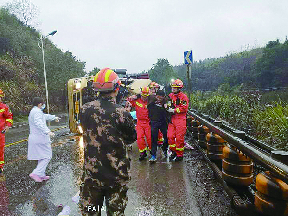 ▲货车侧翻,司机被消防员救出 攸县交警供图