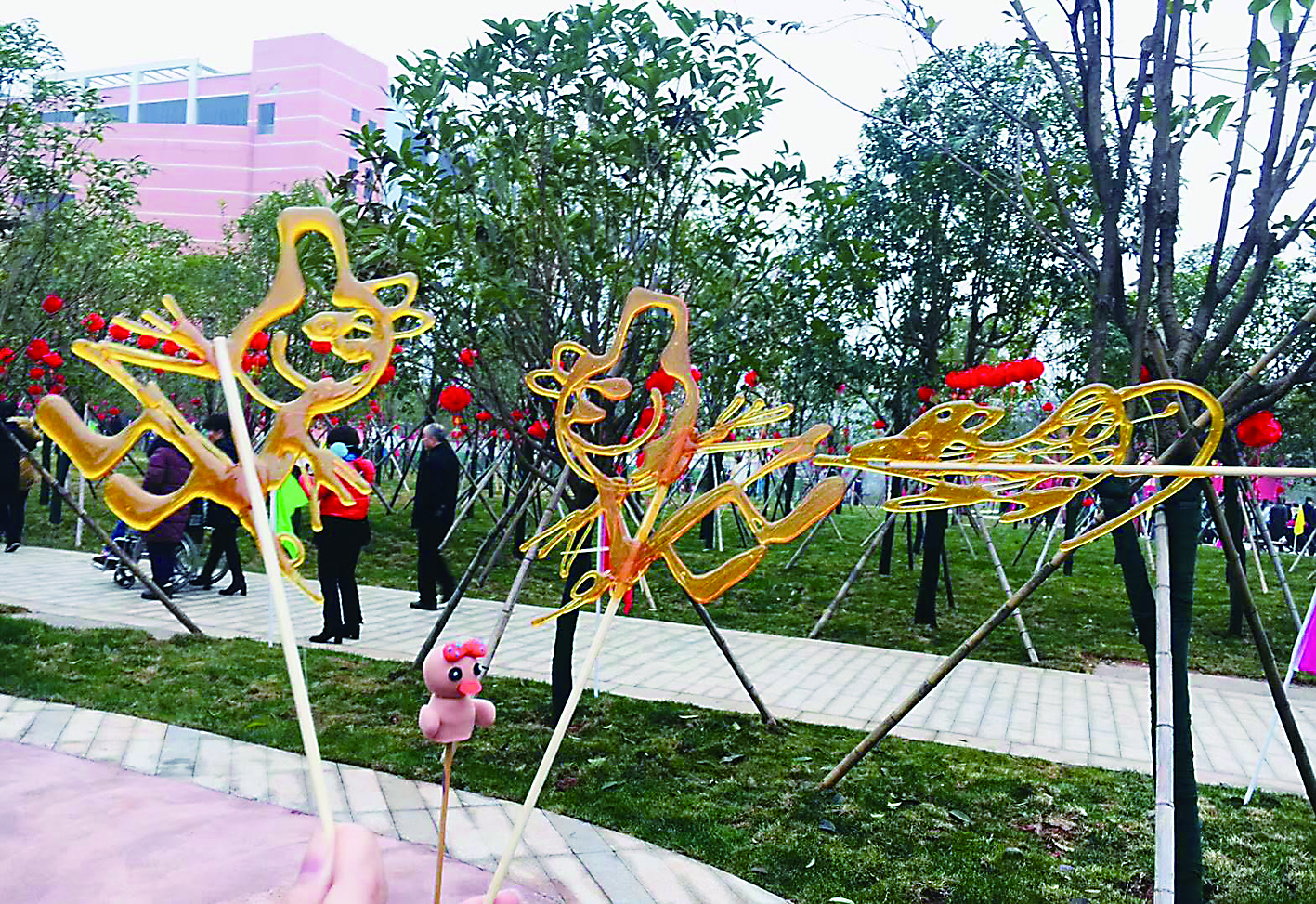 活动现场,上千只五彩缤纷的灯笼点缀上空,吸引人们拿出手机拍照、与好友分享。最吸引人的,大概是糖画制作摊位。民间艺人罗海波做糖画近20年,他熟练地用琥珀色的糖丝作画,不到30秒,一个活灵活现的“小猪”呈现在大家眼前,为前来的市民送上“甜蜜”好礼。