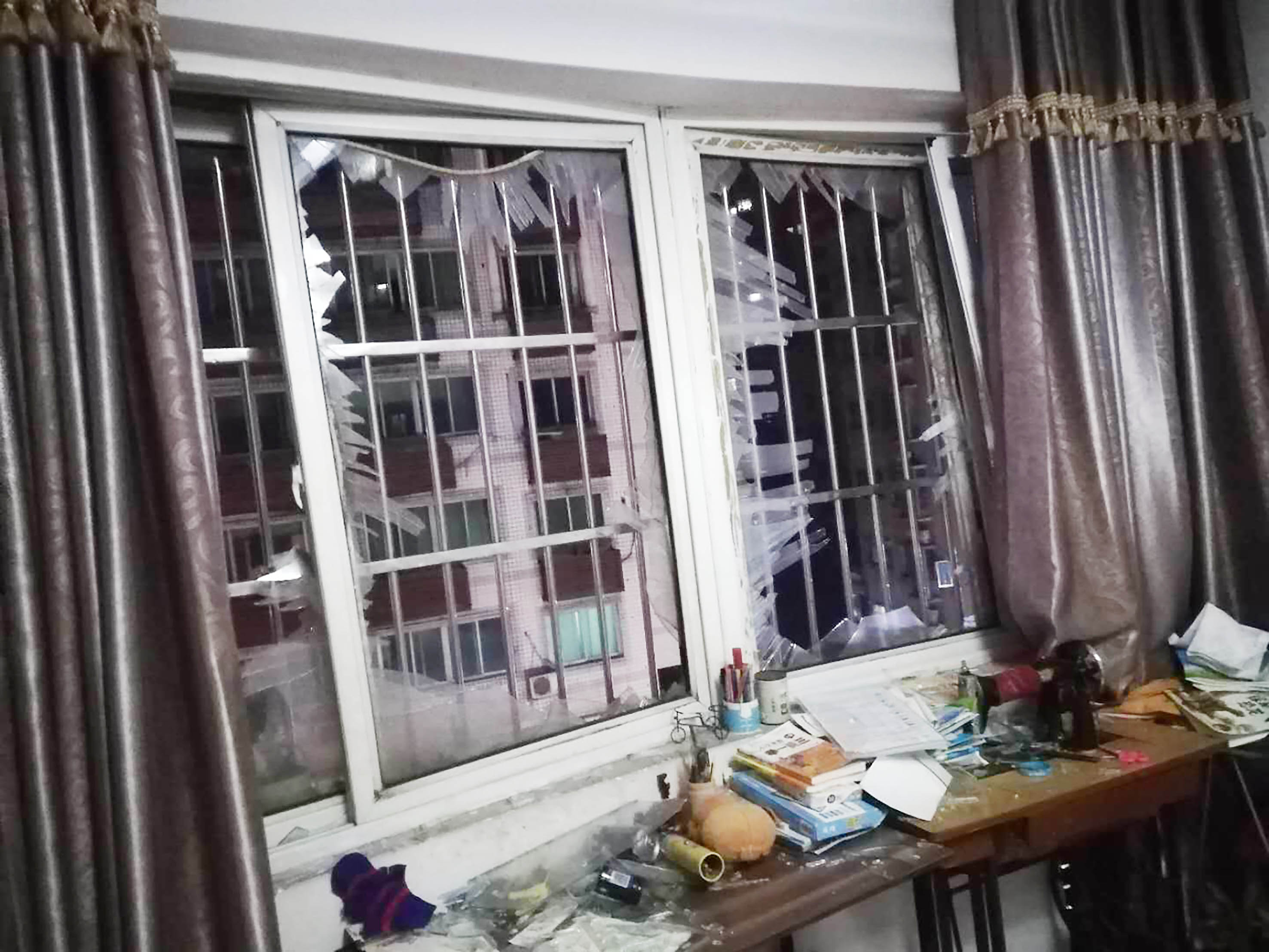 ◀窗户玻璃被震碎 记者 刘玺 摄