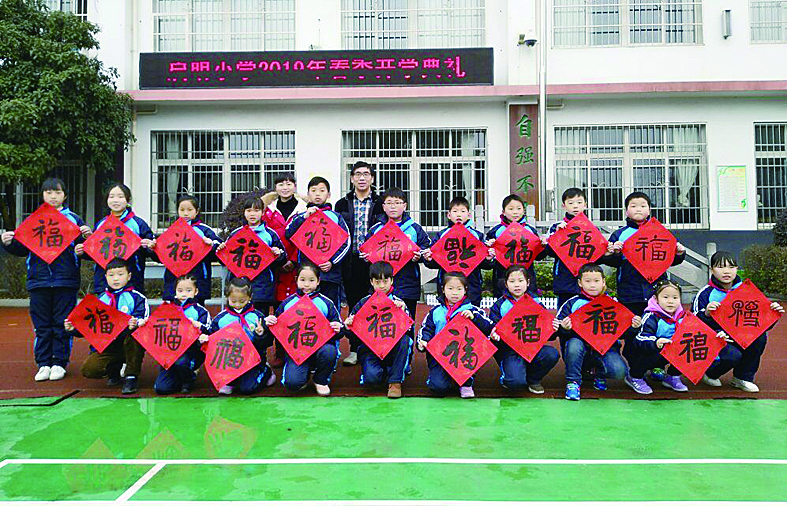荷塘区启明小学前日举行了开学典礼。由于当日是元宵佳节,该校书法家邹建平特意用毛笔字书写了20个不同形体的“福”字,送给每一个班级。每个班级代表手持一个“福”字与老师合影。