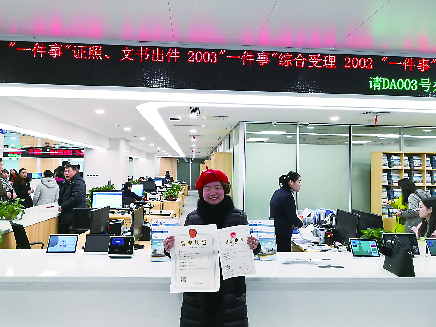 ▲昨日,市民刘慧兰顺利领证,成为我市商事登记“只办一件事”改革后的首个受益者 记者 戴凛 摄
