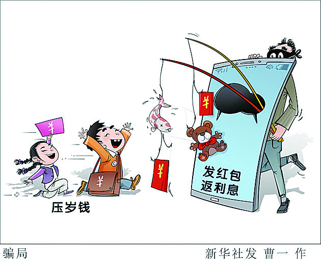 春节后有不法分子盯上了孩子的压岁钱。不法分子诱骗声称,在朋友圈里转发指定的锦鲤、小熊等吉祥物图片,将转发截图发送给不法分子后,就有资格参加他们组织的红包返利活动,一般返利金额较大。比如给不法分子发送1000元“红包”,就可得到返还“红包”2888元;发送“红包”5000元,就可得到返还9888元。受害者上钩后,不法分子又会以各种理由声称受害人转账时操作不当,无法退返红包,需再进行转账才能返利,引诱受害者进一步微信转款。当受害者无力进行更多支付转账时,不法分子就会拉黑受害者。 (据新华社)