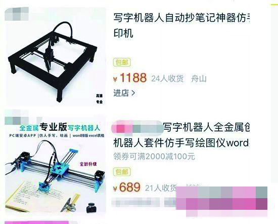 真有这种代写机器人吗?记者从京东、淘宝搜索“写字机器人”后,出现多款类似产品,价格从200多元至2000元不等。其中,一款机械手写字绘图数字机器人为280元,只有几块电路板、连接线,外加一个机械手臂。