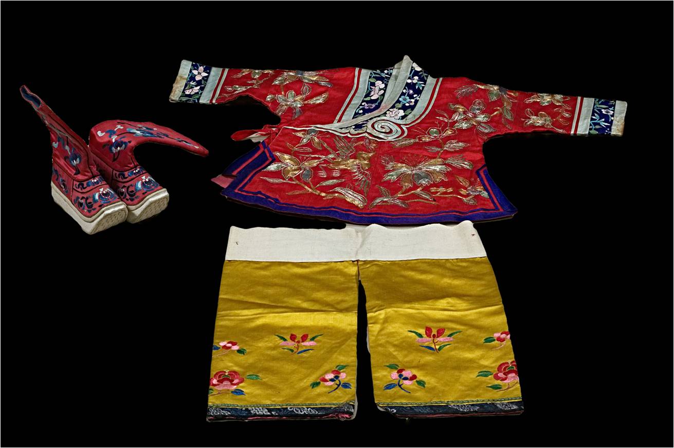 清代儿童服饰1套共3件,其中上衣长51厘米、摆宽47厘米,裤长44厘米、腰宽37厘米,靴长26.8厘米、通高24.5厘米、底宽6厘米。