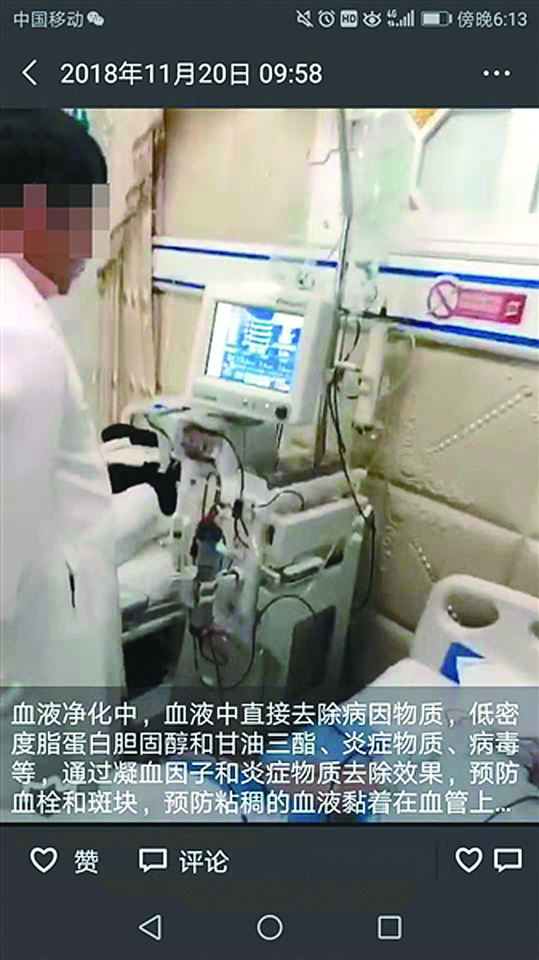 ▲北京一家医疗美容机构在微信朋友圈中介绍血液净化项目