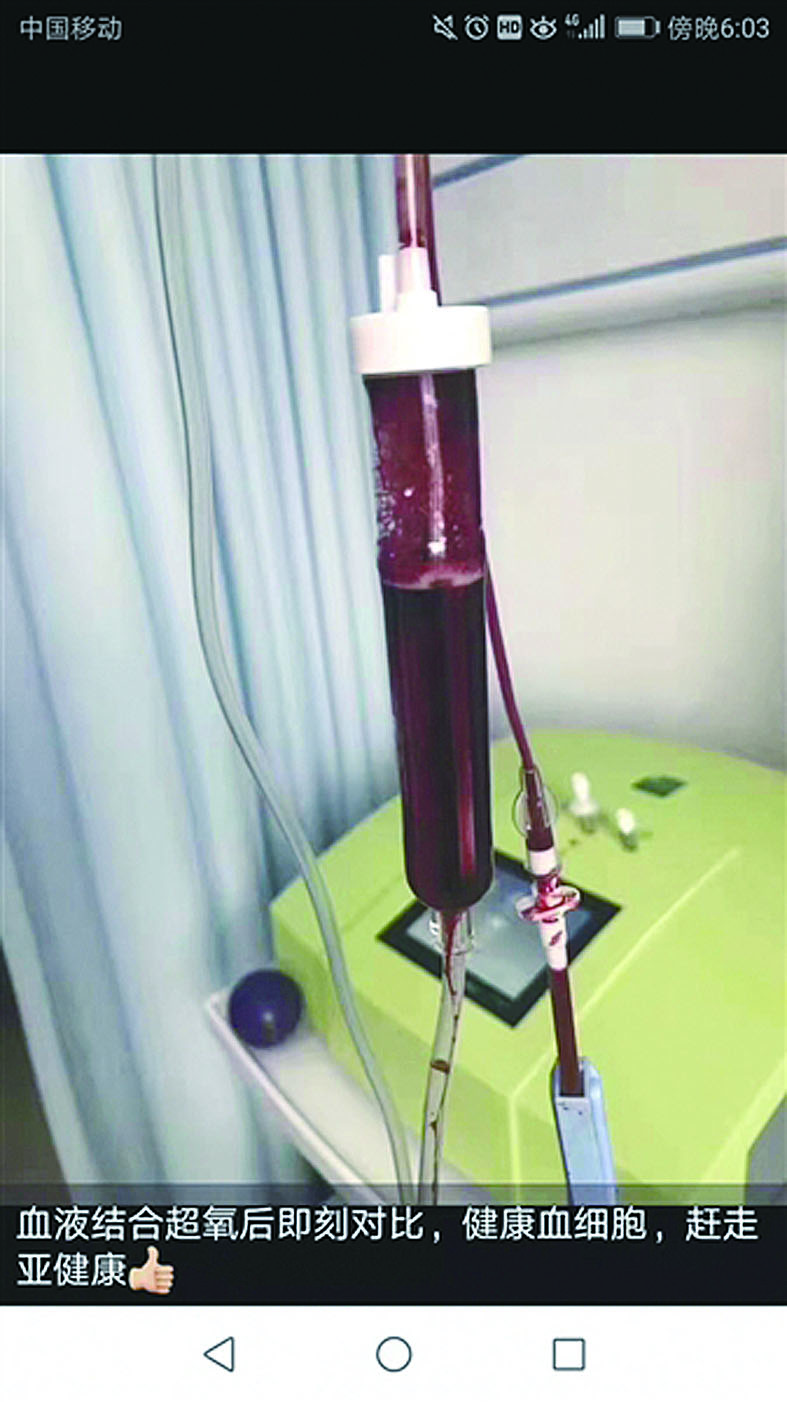 该网友称,抽出的100CC血,呈偏暗红色,注入臭氧开始净化后,血一下子变得鲜红。文中称,该项目促进新陈代谢,调节免疫力和帮助身体排毒。
