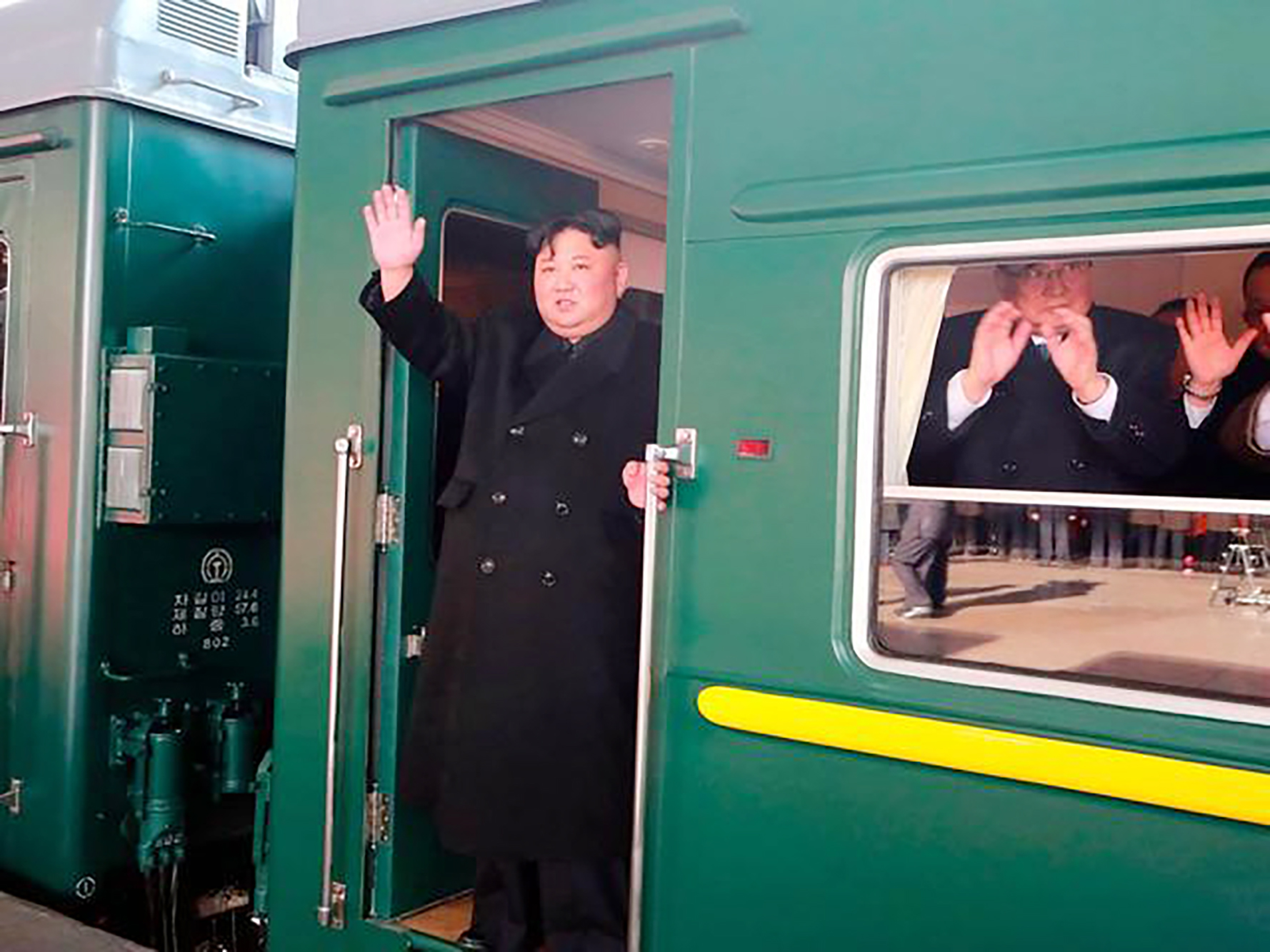 从朝中社发布的照片可见,出发当天,金正恩站在绿色列车的车门位置,向月台上的人挥手致意,同行人员也在车厢内向外挥手。