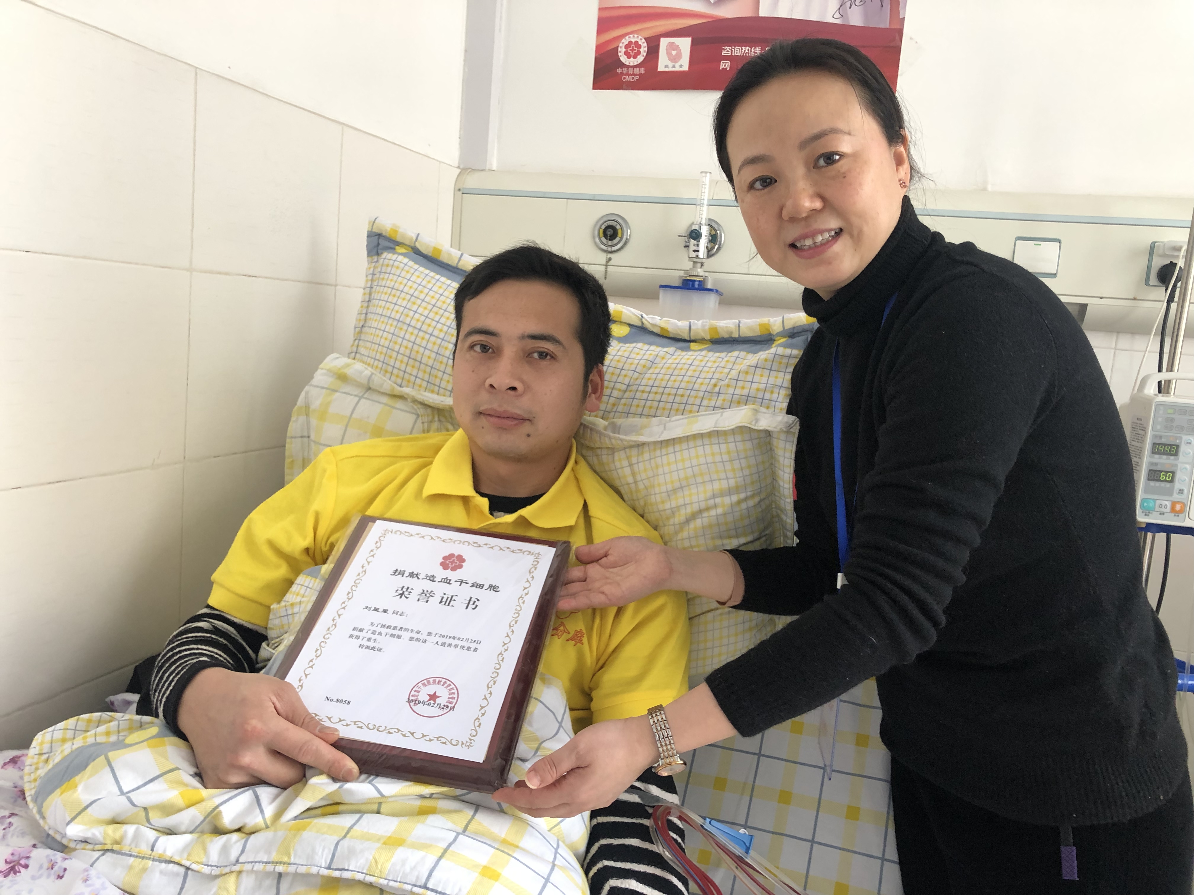 “为了拯救患者的生命,您捐献了造血干细胞。您的这一人道善举使患者获得了重生。”受中国造血干细胞捐献者资料库管理中心的委托,在刘星星采集造血干细胞的过程中,株洲市红十字会向他颁发了荣誉证书。
