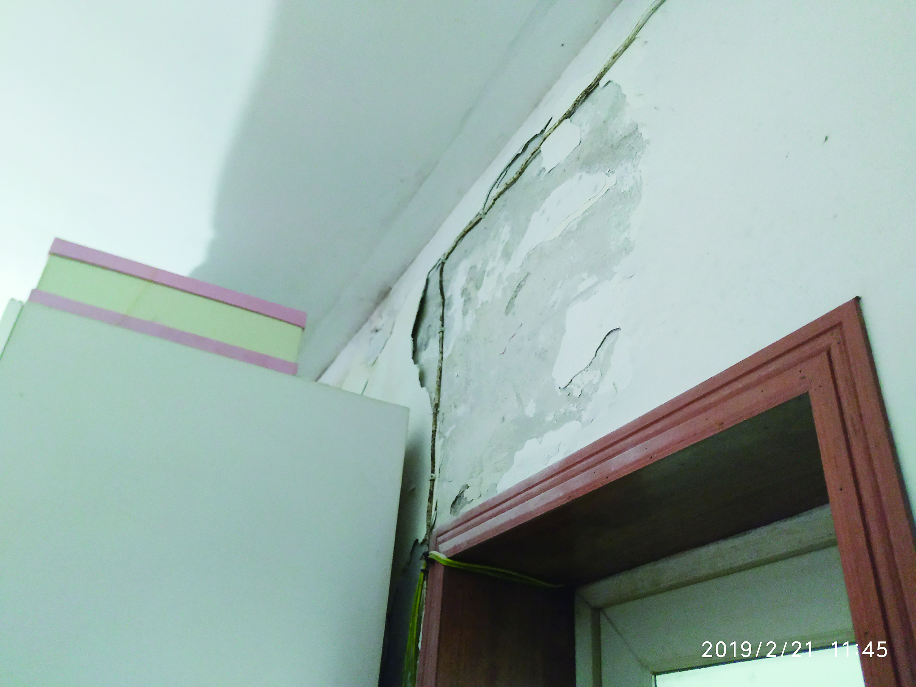 ▲楼上的污水渗到楼下居民家中,泡坏墙壁 记者 姚时美 摄