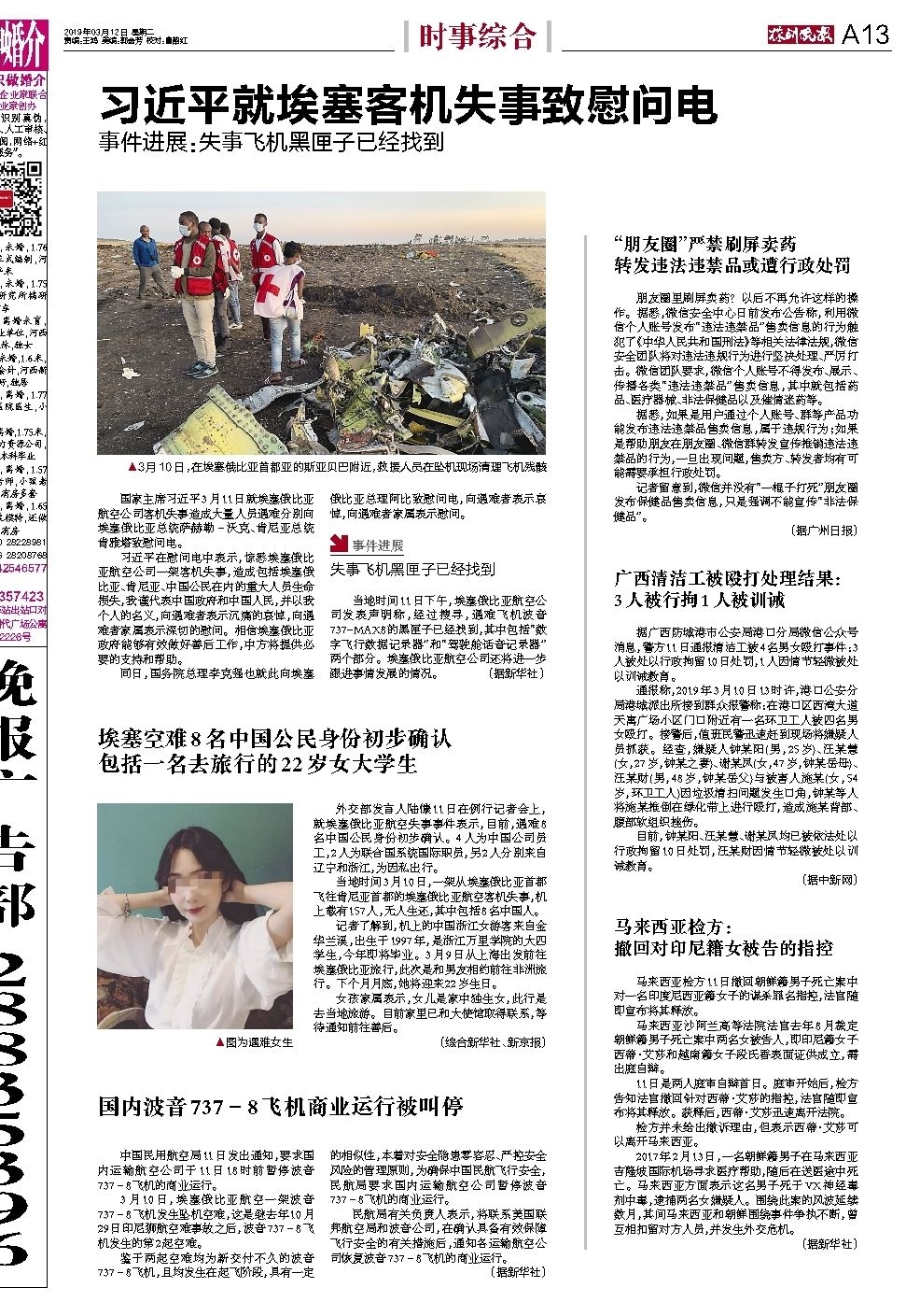 习近平就埃塞客机失事致慰问电事件进展:失事飞机黑匣子已经找到