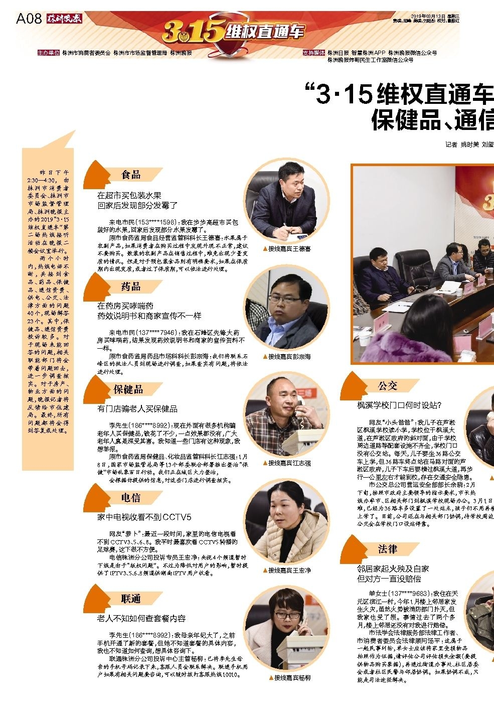 “3·15维权直通车”第二场来电40个 保健品、通信资费投诉多