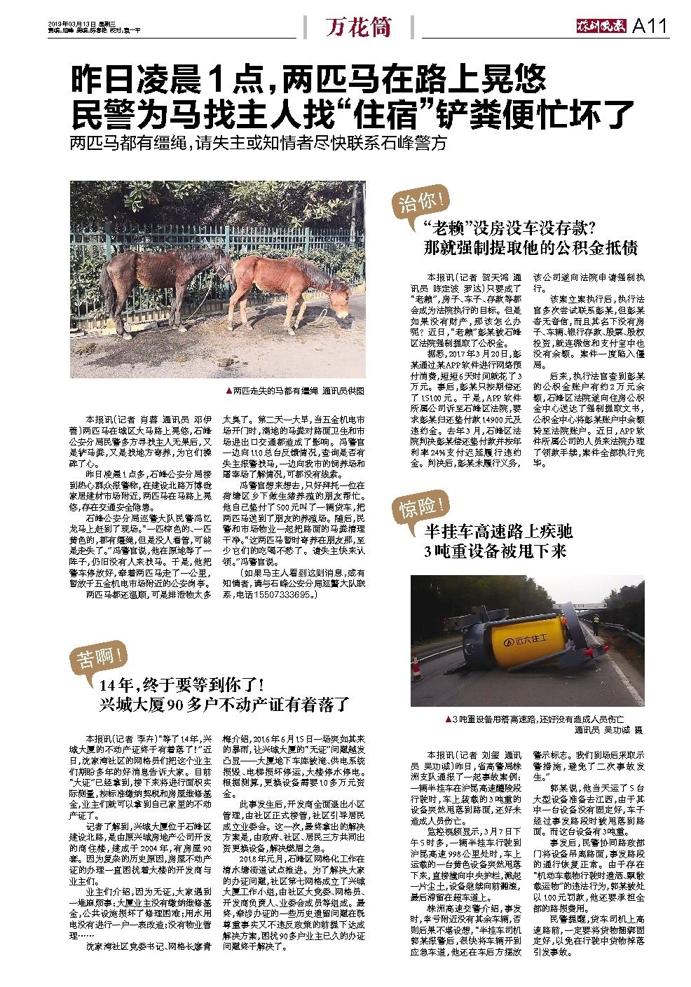 昨日凌晨1点,两匹马在路上晃悠 民警为马找主人找“住宿”铲粪便忙坏了