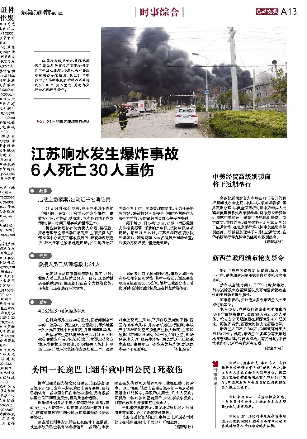 江苏响水发生爆炸事故 6人死亡30人重伤