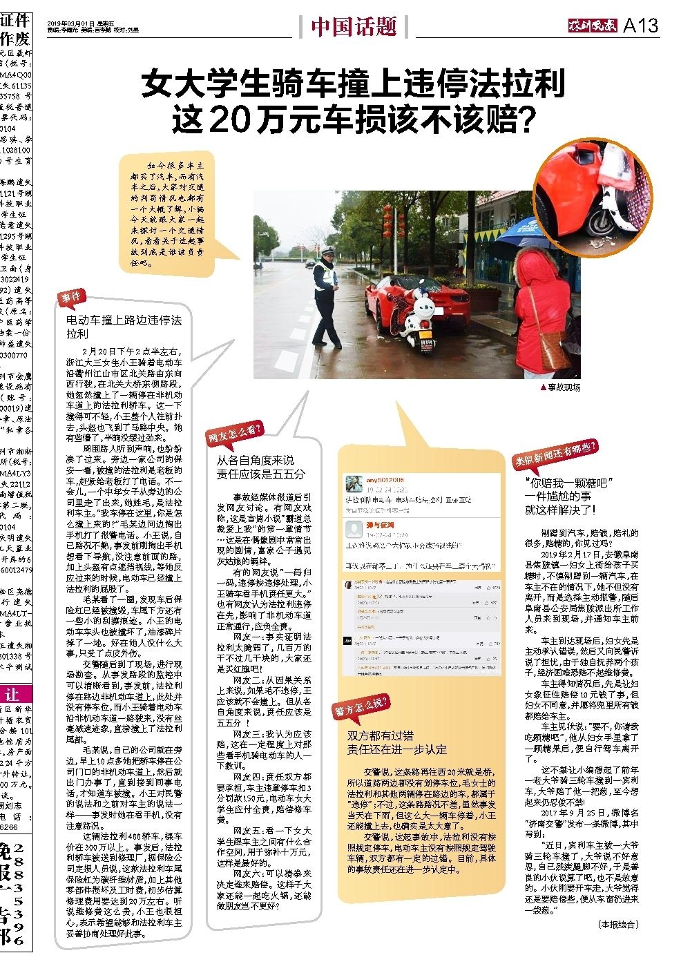 有的网友说“一码归一码,违停按违停处理,小王骑车看手机责任更大。”也有网友认为法拉利违停在先,影响了非机动车道正常通行,应负全责。