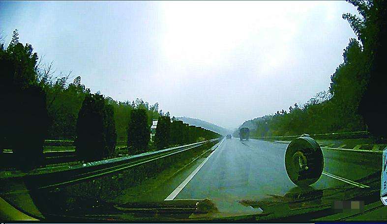 李某车上的行车记录仪显示,车子当时在行车道行驶,突然有两个大车轮从右前方滚了过来,他赶紧减速变道避让,但车还是被其中一个车轮撞到。