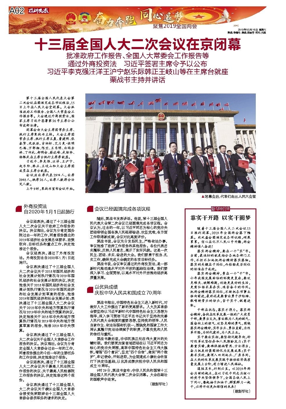 第十三届全国人民代表大会第二次会议在圆满完成各项议程后,15日上午在人民大会堂闭幕。大会批准政府工作报告、全国人大常委会工作报告等。大会通过外商投资法,国家主席习近平签署第26号主席令公布这部法律。