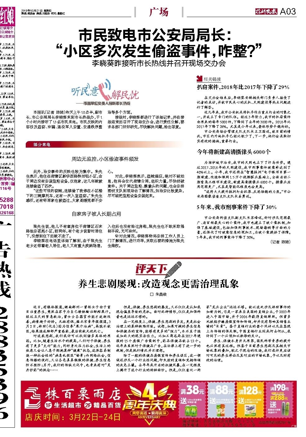 本报讯(记者 陈驰)昨天上午10点半,副市长、市公安局局长李晓葵来到市长热线办,于1个小时内接听了13名市民来电。市民反映的内容涉及盗窃、诈骗、退役军人安置、交通秩序整治等多个方面。