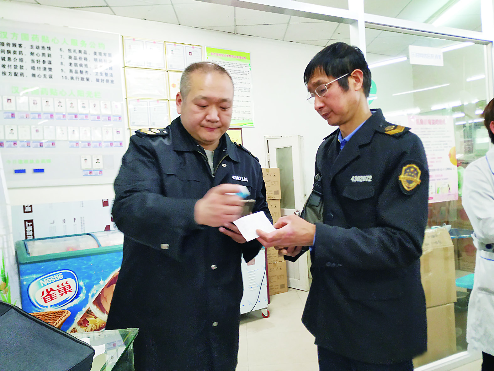 ▲执法人员在汉方国药贴心人店检查 记者 姚时美 摄