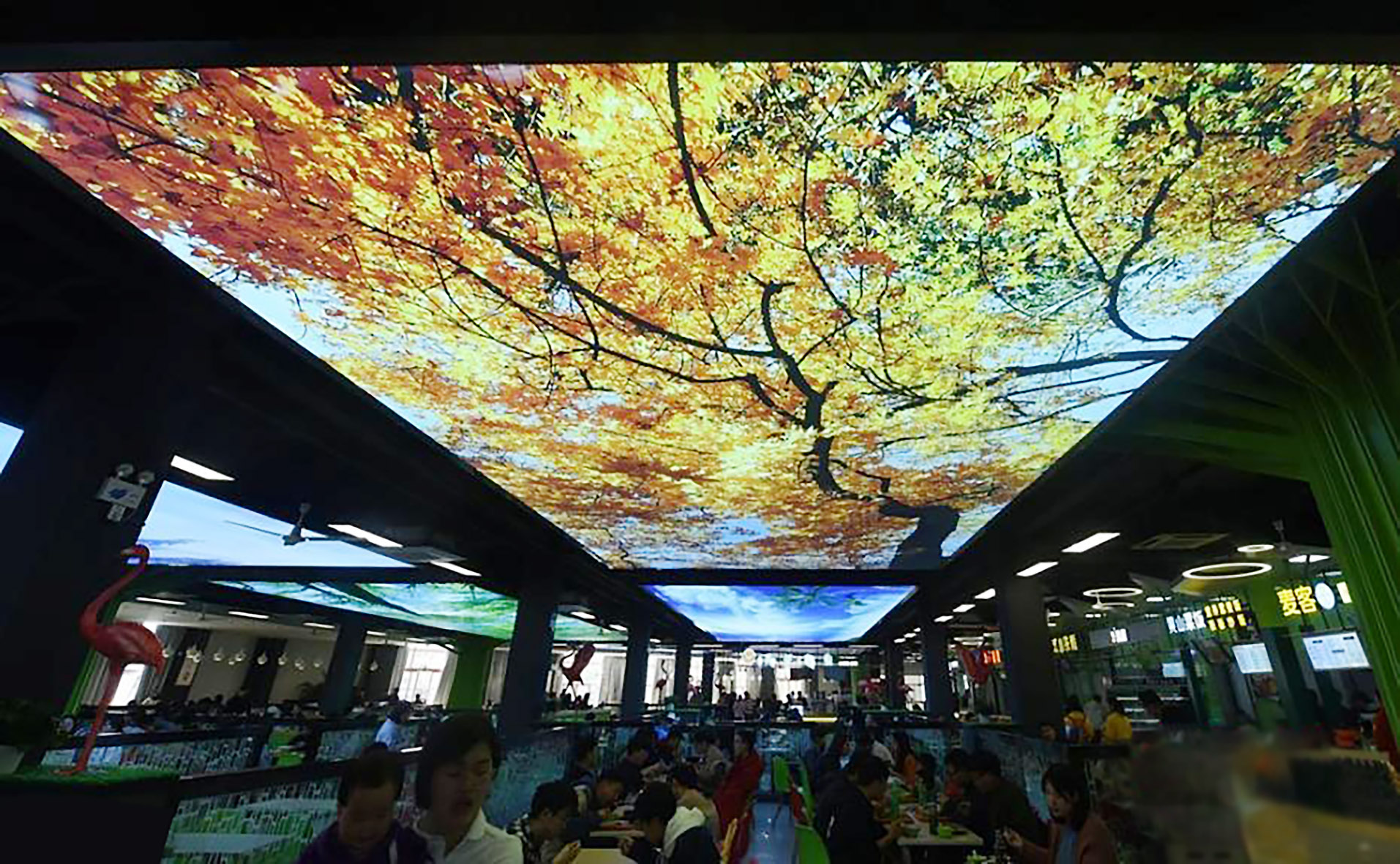 近日,位于杭州的浙江农林大学的一食堂在翻新之后,在吊顶安装了四块超大尺寸幕布,投射四季自然风光,同学们可边吃饭边抬头欣赏四季美景,受到不少学生的欢迎。
