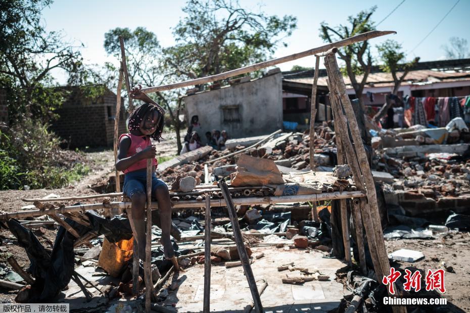 ▲一名小女孩儿在被强热带气旋“伊代”破坏的居民区上玩耍