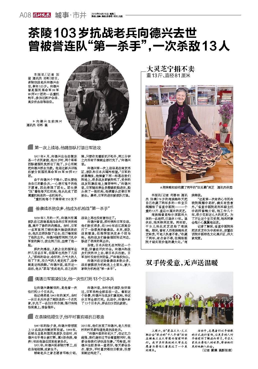 茶陵103岁抗战老兵向德兴去世 曾被誉连队“第一杀手”,一次杀敌13人