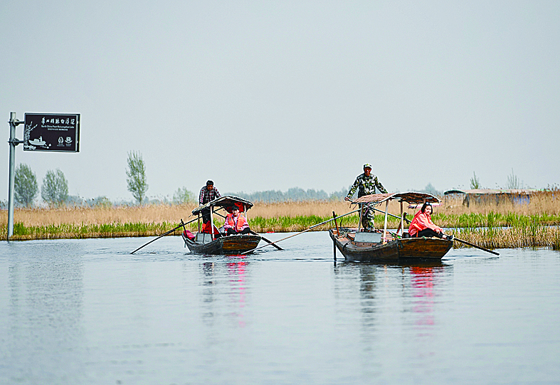 ▲游客在雄安新区安新县白洋淀景区乘船游览