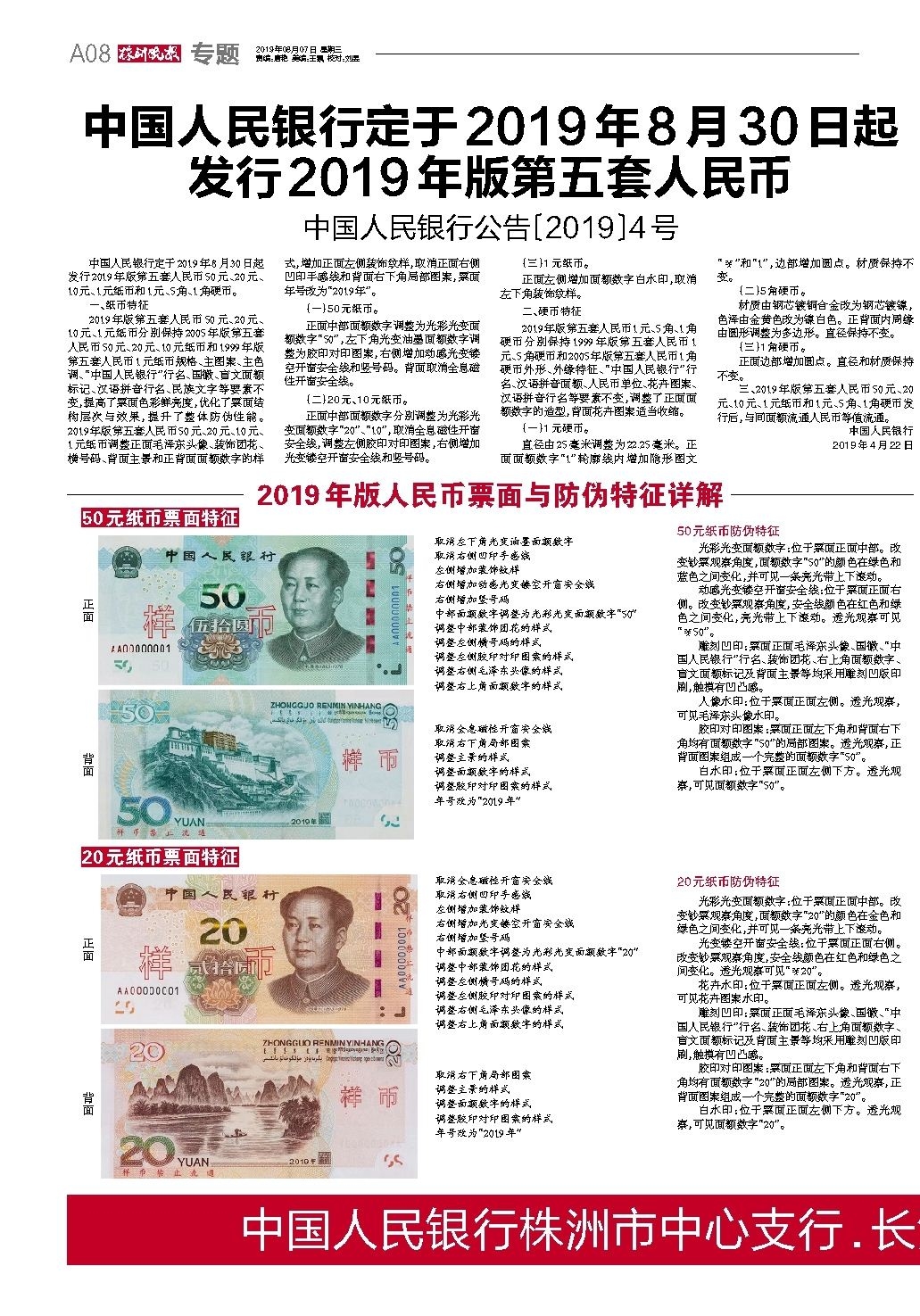中国人民银行定于2019年8月30日起 发行2019年版第五套人民币