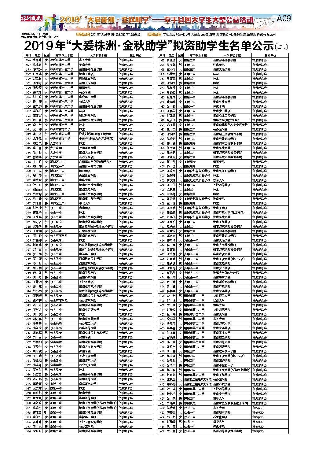 2019年“大爱株洲·金秋助学”拟资助学生名单公示(二)