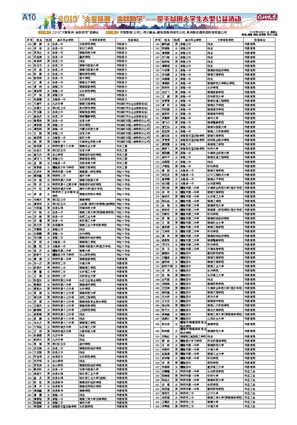 2019年“大爱株洲·金秋助学”拟资助学生名单公示(二)