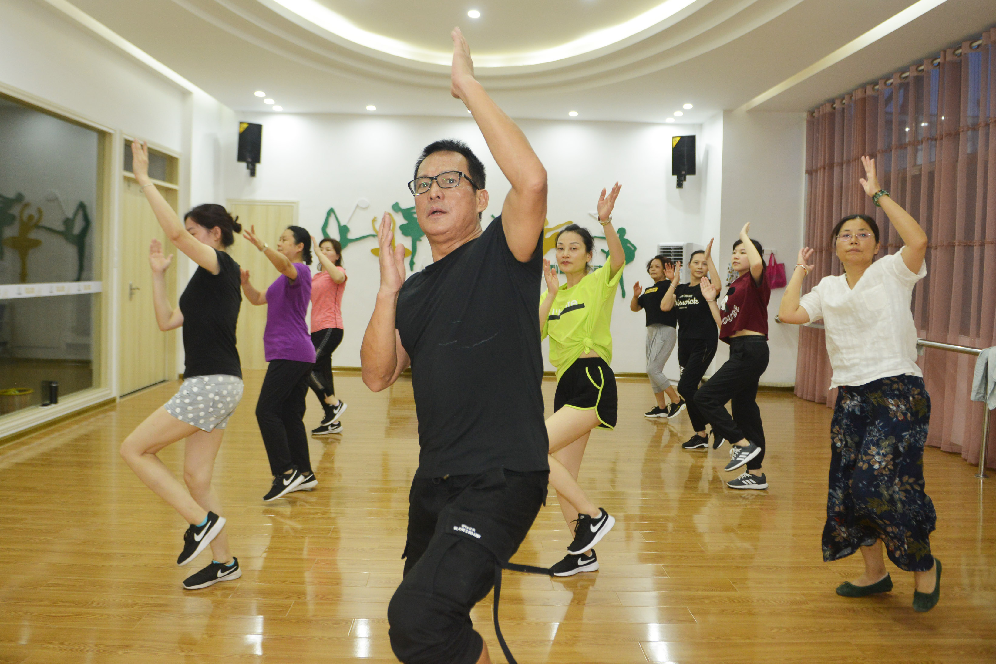 ▲在大湖塘社区宽敞明亮的舞蹈室,郭春与学员们一起领略鬼步舞的魅力