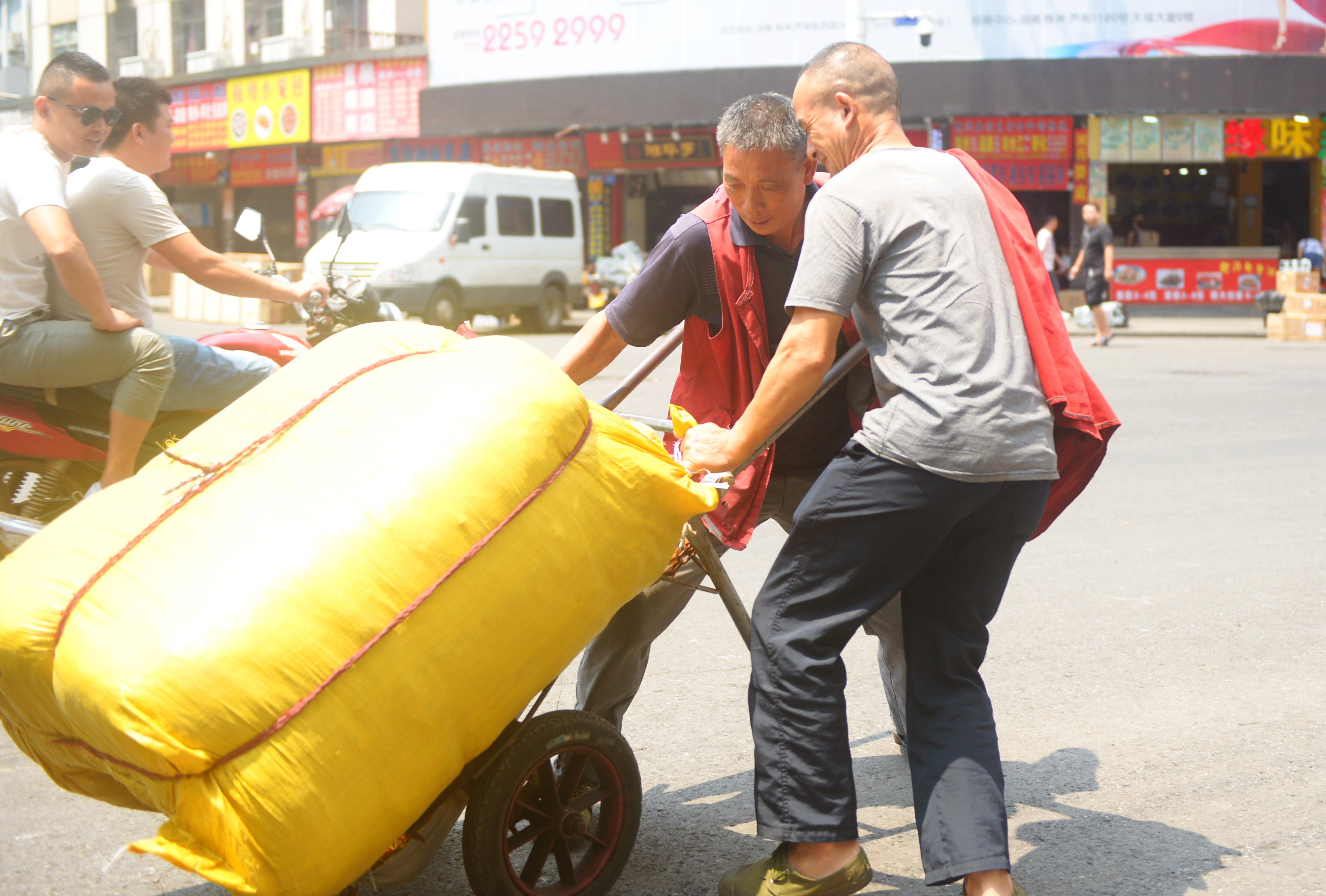 这些背包人,也成了产业链上非常重要的一环。他们在相对拥挤的市场群道路中,架起了市场、车站、加工厂、物流园的桥梁,让产品更快、更灵活地送达。