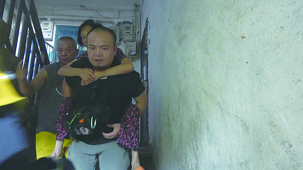 ▶在消防员保护下,一名被困老人被背下楼 消防员供图