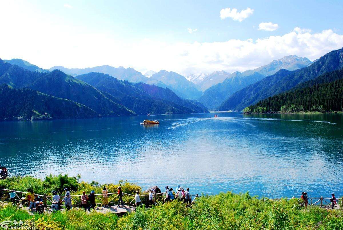 素有“瑶池”之称的天山天池,湖水清澈,晶莹如玉。四周群山环抱,绿草如茵,野花似锦。挺拔、苍翠的云杉、塔松,漫山遍岭,遮天蔽日,成为许多人的神往之地,该湖得名自乌鲁木齐都统明亮于乾隆四十八年(1783年)所做的题记。