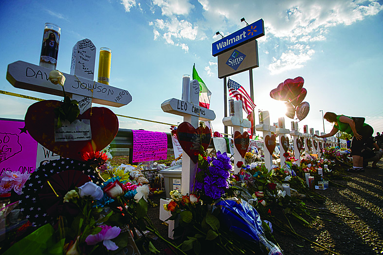 埃尔帕索的悼念 8月5日,人们在美国得克萨斯州埃尔帕索市的沃尔玛超市枪击案现场附近悼念逝者。 美国得克萨斯州西部埃尔帕索市一家沃尔玛超市3日上午突发枪击事件,造成22人丧生,20余人受伤。