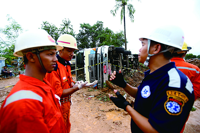 缅甸山体滑坡51人遇难 8月11日,在缅甸南部孟邦,救援人员在受灾现场工作。 缅甸消防部门11日说,缅甸南部孟邦9日发生的山体滑坡死亡人数升至51人。