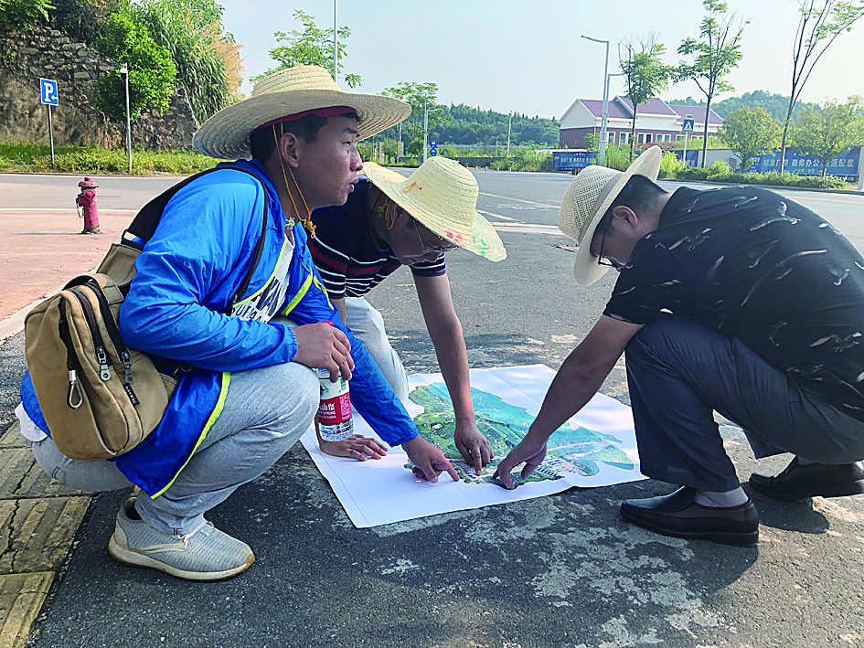 ▲烈日下,雷磊、齐怀三、杨智在仔细核查国土数据