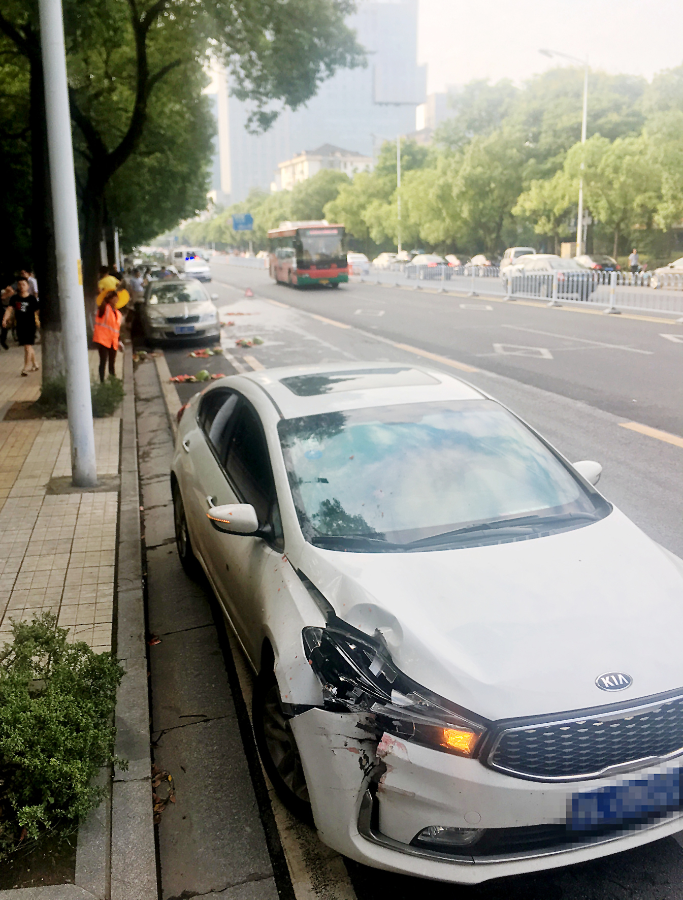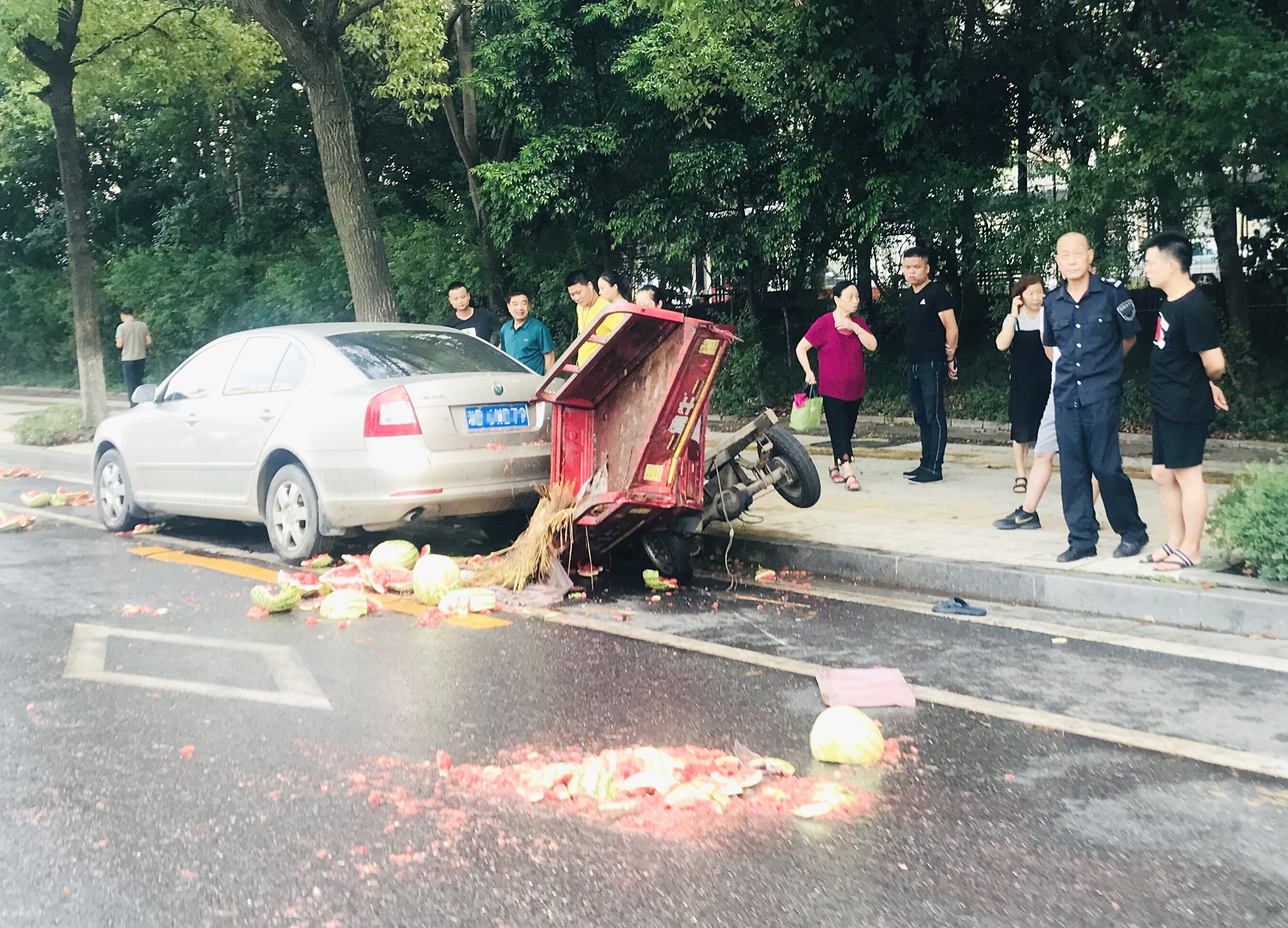 昨日下午,天元区黄河南路市财政局路段,一辆白色小车撞上一辆装着不少西瓜的三轮车,破碎的西瓜落得一地。白色小车驾驶员介绍,事发时她原本在中间车道行驶,结果突然发现三轮车从右侧靠近,此时她已躲避不及,发生撞击。