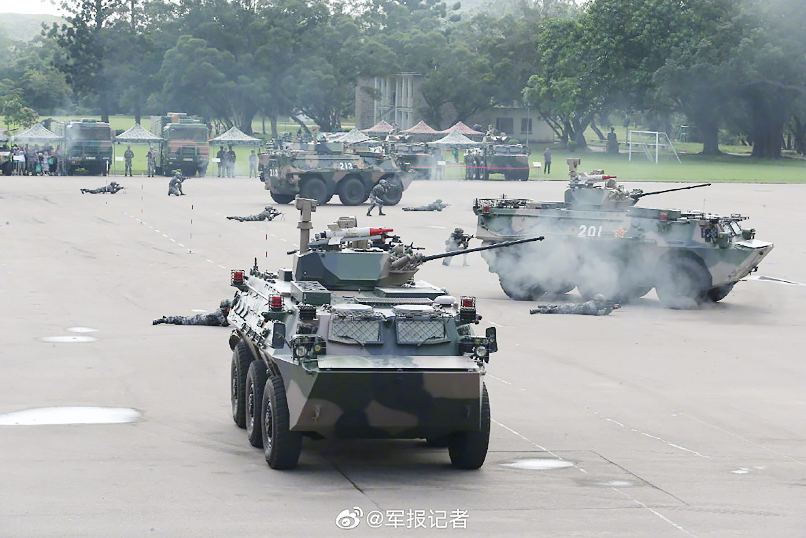 从之前阅兵直播画面以及公开报道看,驻港部队陆军装备了92B型轮式步兵战车、07型轮式装甲指挥车、轮式装甲抢修车、东风“猛士”侦察车、特种摩托车等车辆。轻武器则包括95枪族、多型冲锋枪、狙击步枪、反器材步枪及榴弹发射器、火箭筒等。此外,还装备了“红旗-6”弹炮结合防空系统、防化侦察车、防化化验车等。