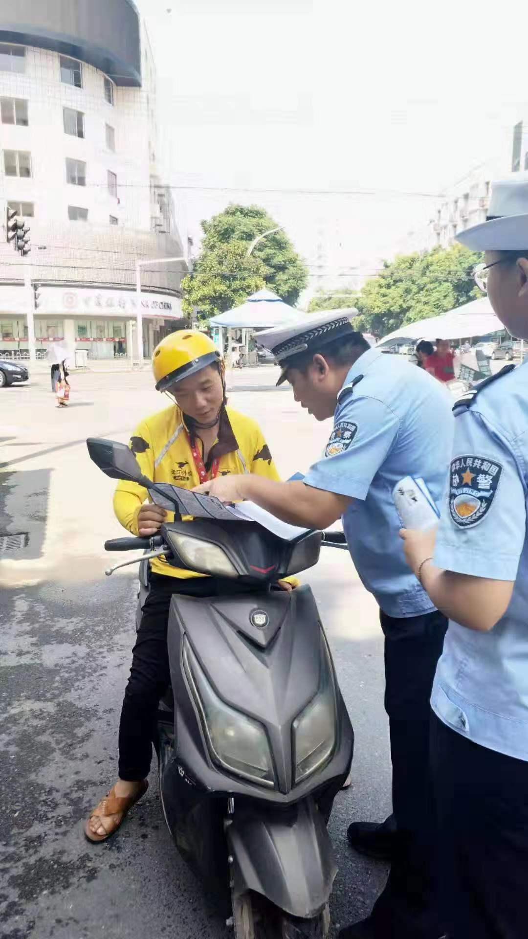 ▲交警向电动车驾驶员发放宣传册 记者 刘玺 摄