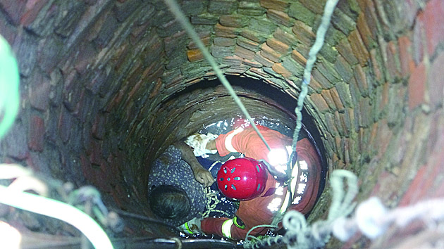 ▲消防员下井救人 通讯员 陈祥 摄