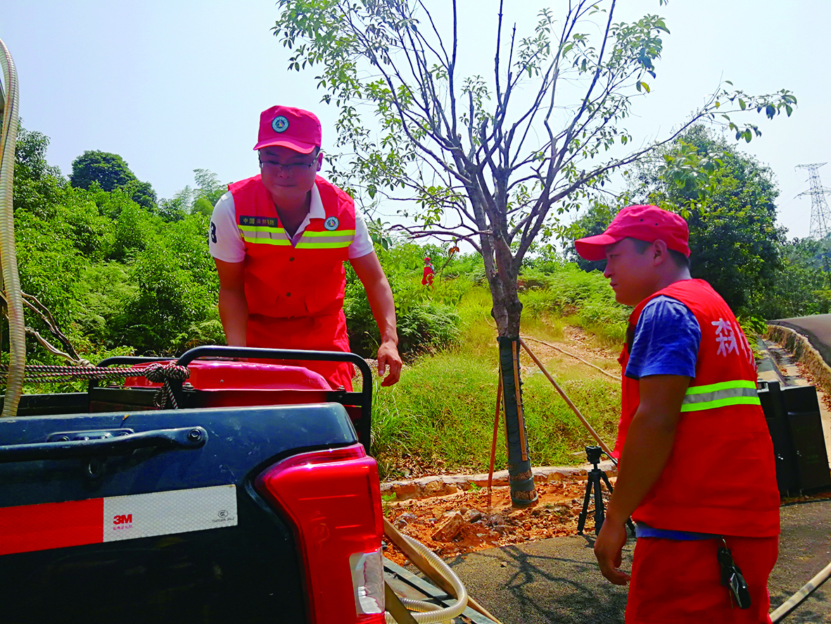 本周气温居高不下。石峰区九郎山和长石片区山体都属于长株潭“绿心”范围,这几年一直在进行生态复绿,不少苗木尚且稚嫩,需要浇水护苗。上午4点到10点开工,下午4点到晚上9点收工,这既是浇水的规律,也避免了午间最高温的暴晒。