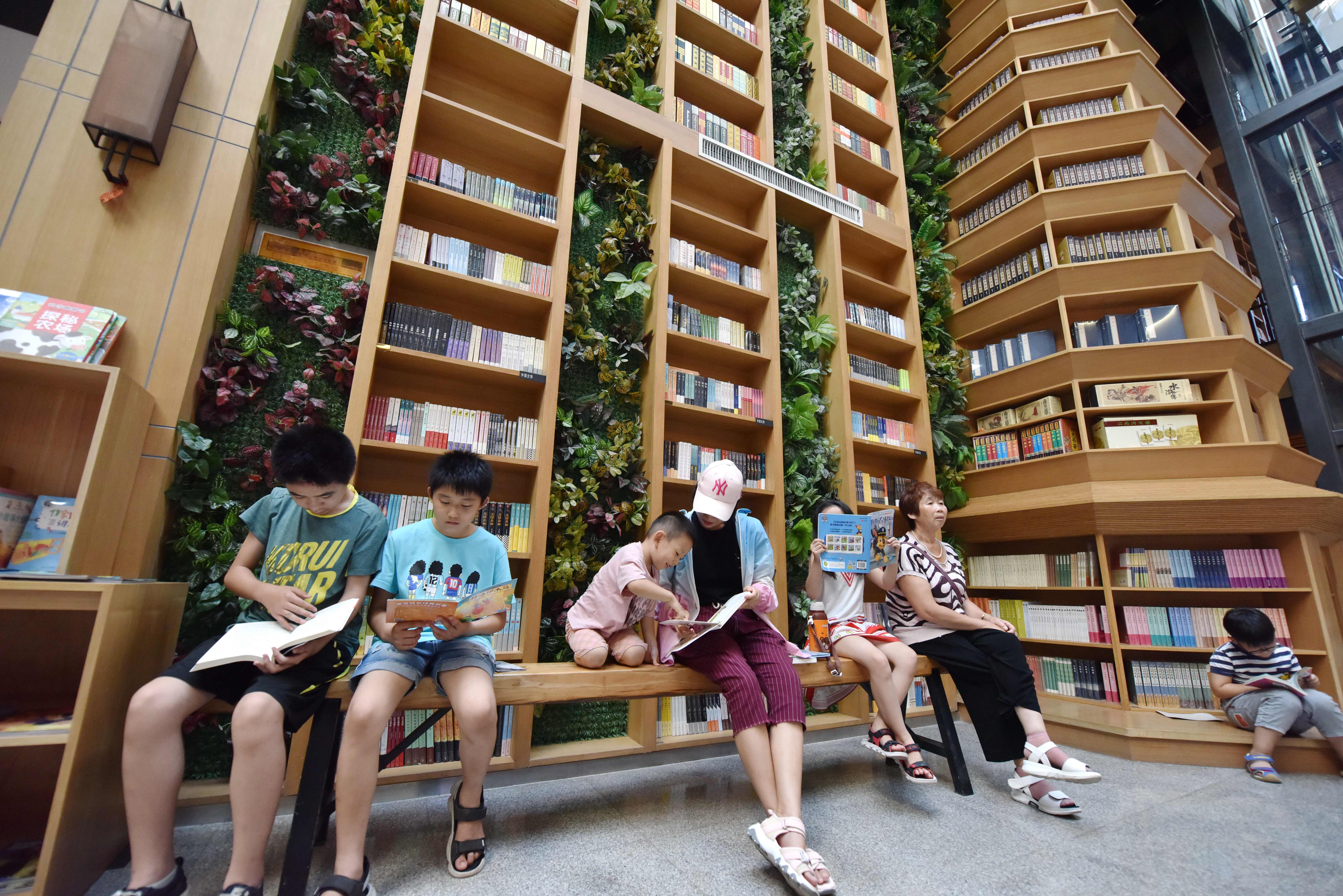 8月18日,家长和孩子们在河北省定州市新华书店阅读图书。