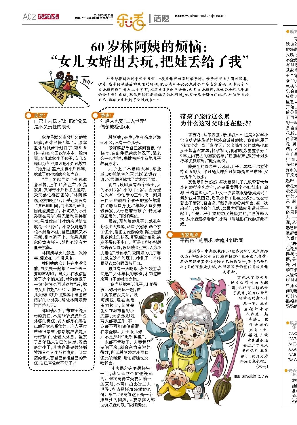 对于即将到来的中秋小长假,一些父母开始筹划亲子游。亲子游听上去固然温馨,但是,当带娃旅游困难重重的时候,能否请爷爷奶奶或外公外婆在家看娃,夫妻两个人出去旅游呢?针对上小学前,尤其是3岁以内的娃,夫妻出去旅游,把娃扔给老人带真的合适吗?最近,家住芦淞区南沿社区的林阿姨,就因女儿女婿出门旅游、把孩子丢给自己,而与女儿打起了冷战起来……