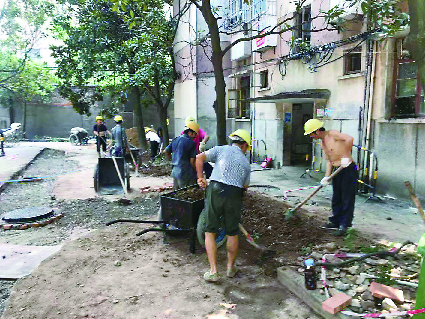 昨天下午,记者施工现场看到,挖土机、拖渣土车的轰鸣声此起彼伏,正紧张进行社区公共区域的修缮,新建雨污分流排水管道、房屋楼道亮化等同步进行。