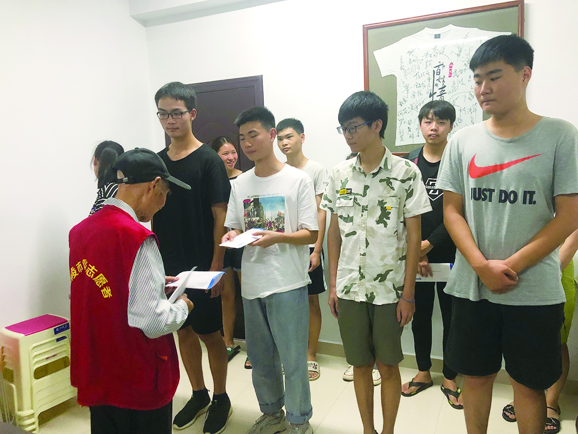 ▲陈自绪老人代为发放受助学子助学金 记者 郑炜青 摄