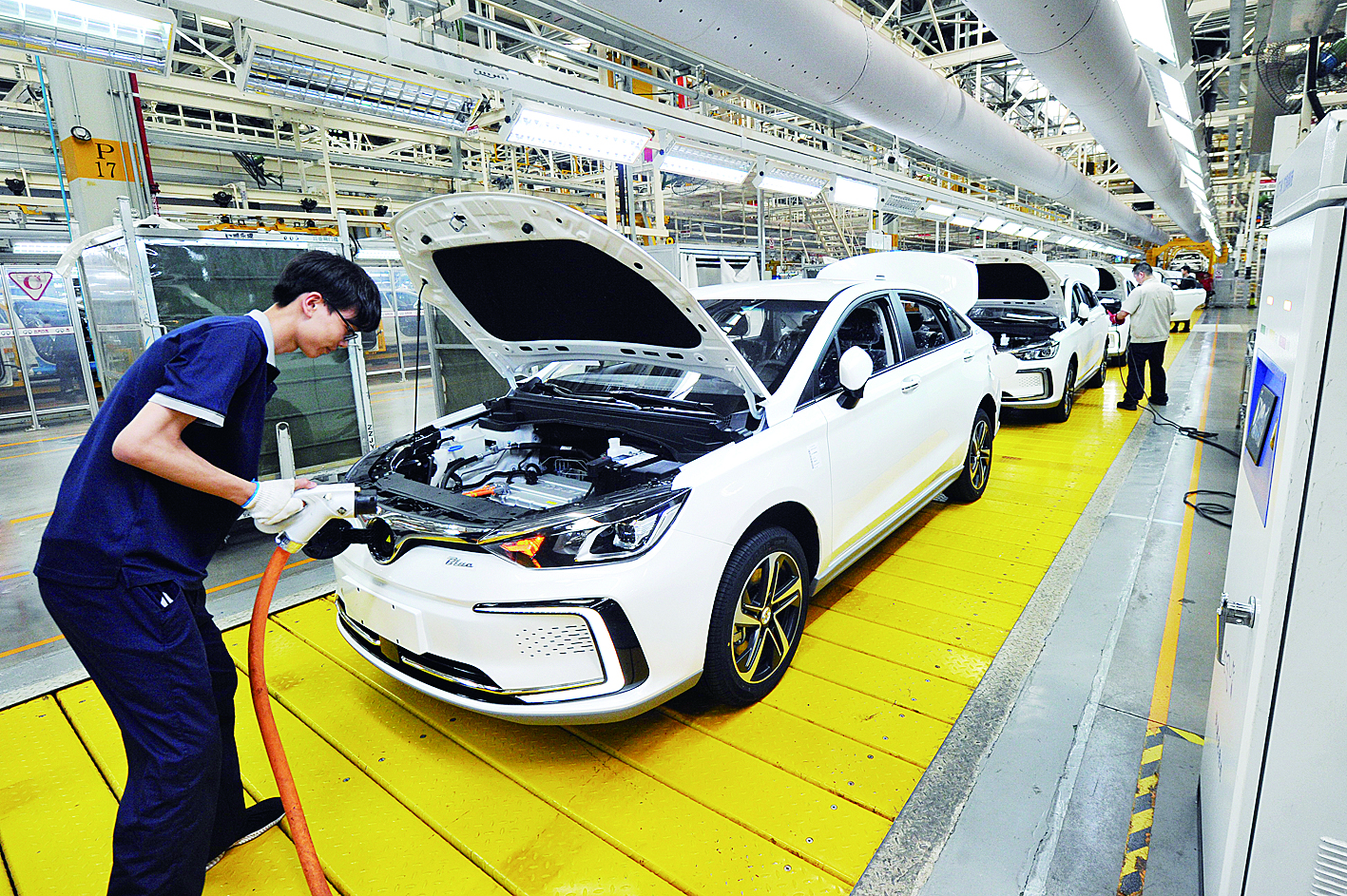 “爆款”EU5,株洲造! 8月23日,在北汽株洲分公司二工厂的试驾跑道上,试驾员陈定驾驶着刚生产的新能源EU5体验路况。上半年,这款新能源EU5销量达47439辆,成为国内纯电动车、新能源汽车市场双料冠军。 续航里程500公里,售价13万元左右,这样的性价比,让北汽新能源EU5一上市便深受消费者欢迎,还成为不少网约车公司的首选。 (株洲日报记者 胡乐 通讯员 黄进) ◀一台准备下线的北汽新能源EU5正在充电 记者 谭清云 摄