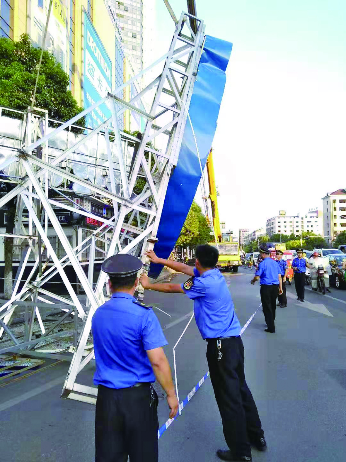 ▲荷塘城管大队组织拆除违规户外广告牌 通讯员 供图