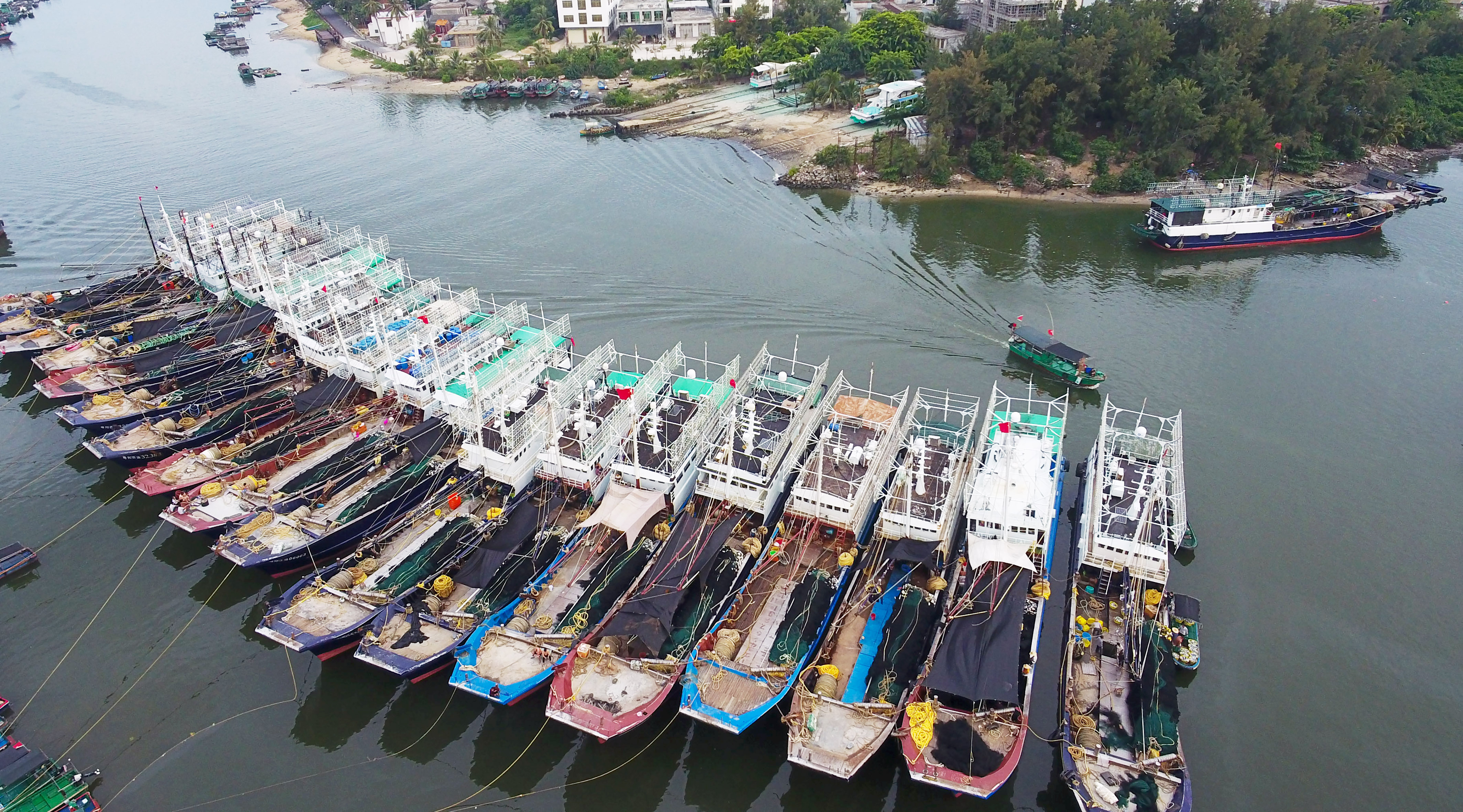 8月28日,渔船在琼海市潭门渔港停靠避风(无人机拍摄)。